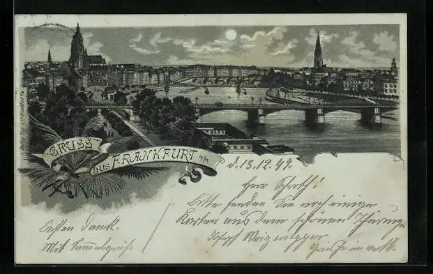 Mondschein-Lithographie Frankfurt a. M., Totalansicht mit Flusspartie