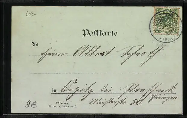 Personenbezogene Daten auf der Rückseite der Karte wurden durch blauen Textmarker unkenntlich gemacht. Die blauen Stellen sind auf die Vorderseite durchgeweicht und wirken sich negativ auf das Postkartenfoto aus