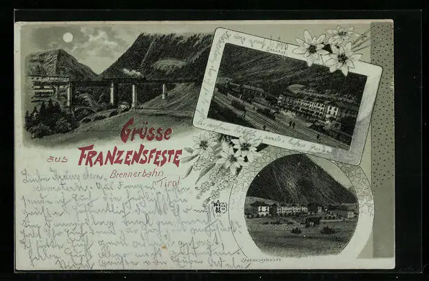 Mondschein-Lithographie Franzensfeste, Ortsansicht mit Bahnhof