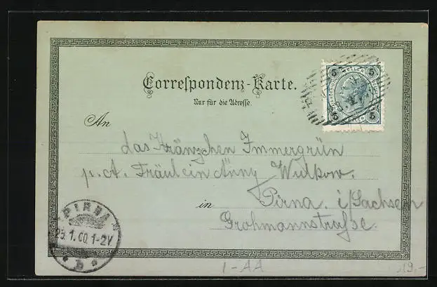 Personenbezogene Daten auf der Rückseite der Karte wurden durch blauen Textmarker unkenntlich gemacht. Die blauen Stellen sind auf die Vorderseite durchgeweicht und wirken sich negativ auf das Postkartenfoto aus