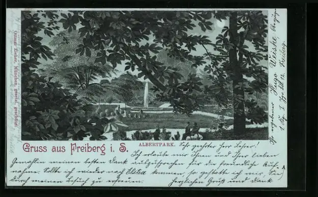 Mondschein-Lithographie Freiberg i. S., Albertpark mit Springbrunnen