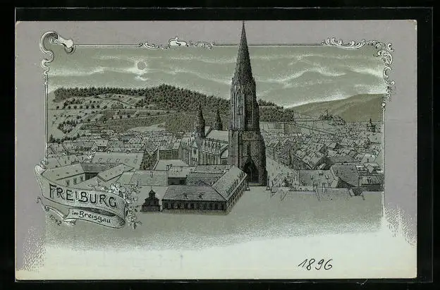 Mondschein-Lithographie Freiburg im Breisgau, Teilansicht mit Kirche