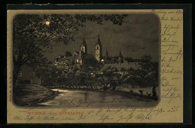 Mondschein-Lithographie Freising, Uferpartie mit Ort