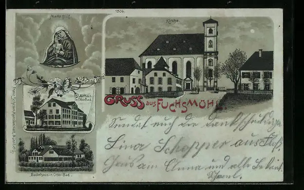 Mondschein-Lithographie Fuchsmühl, Kurhaus in Otto-Bad, Badehaus, Kirche