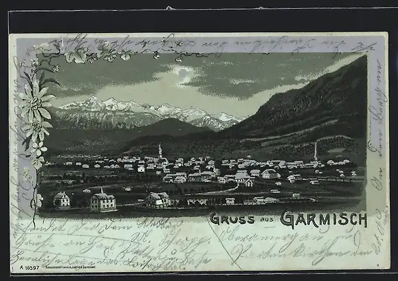 Mondschein-Lithographie Garmisch, Teilansicht mit Bergen