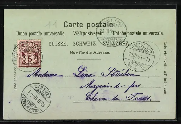 Personenbezogene Daten auf der Rückseite der Karte wurden durch blauen Textmarker unkenntlich gemacht. Die blauen Stellen sind auf die Vorderseite durchgeweicht und wirken sich negativ auf das Postkartenfoto aus