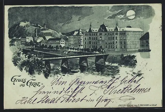 Mondschein-Lithographie Graz, Flusspartie mit Brücke