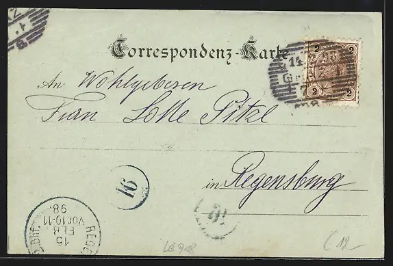 Personenbezogene Daten auf der Rückseite der Karte wurden durch blauen Textmarker unkenntlich gemacht. Die blauen Stellen sind auf die Vorderseite durchgeweicht und wirken sich negativ auf das Postkartenfoto aus