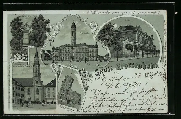 Mondschein-Lithographie Grossenhain, Rathaus, Post, Kupferbergturm