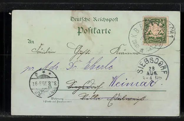 Personenbezogene Daten auf der Rückseite der Karte wurden durch blauen Textmarker unkenntlich gemacht. Die blauen Stellen sind auf die Vorderseite durchgeweicht und wirken sich negativ auf das Postkartenfoto aus
