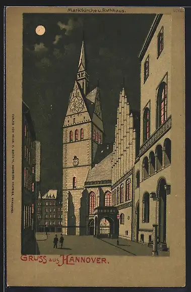 Mondschein-Lithographie Hannover, Marktkirche und Rathaus