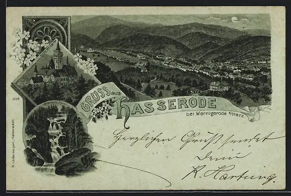 Mondschein-Lithographie Hasserode, Schloss Wernigerode, Wasserfall, Gesamtansicht