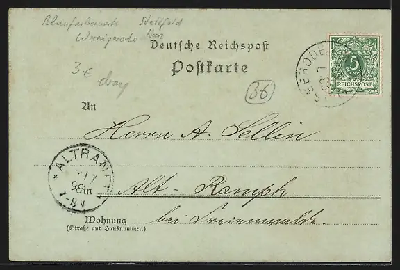 Personenbezogene Daten auf der Rückseite der Karte wurden durch blauen Textmarker unkenntlich gemacht. Die blauen Stellen sind auf die Vorderseite durchgeweicht und wirken sich negativ auf das Postkartenfoto aus