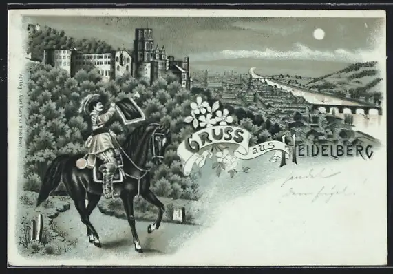 Mondschein-Lithographie Heidelberg, Ortsansicht mit Reiter