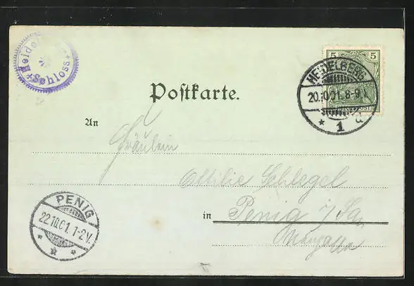 Personenbezogene Daten auf der Rückseite der Karte wurden durch blauen Textmarker unkenntlich gemacht. Die blauen Stellen sind auf die Vorderseite durchgeweicht und wirken sich negativ auf das Postkartenfoto aus