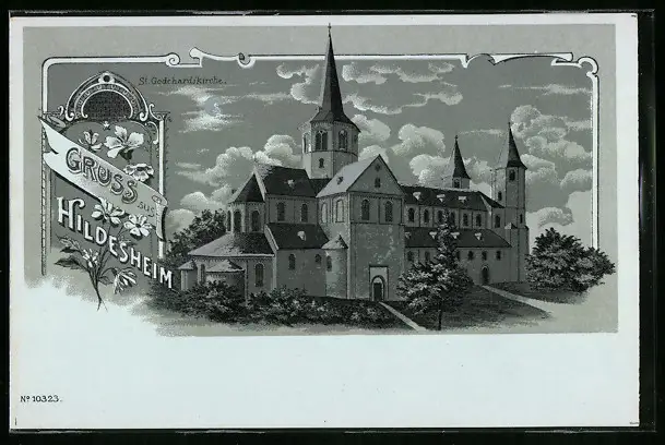 Mondschein-Lithographie Hildesheim, Ansicht der St. Godehardikirche