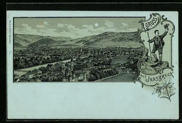 Mondschein-Lithographie Innsbruck, Panoramablick auf den Ort