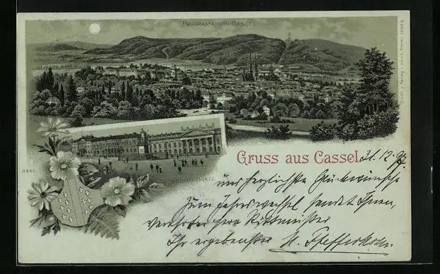 Mondschein-Lithographie Kassel, Panorama, Passanten am Friedrichsplatz