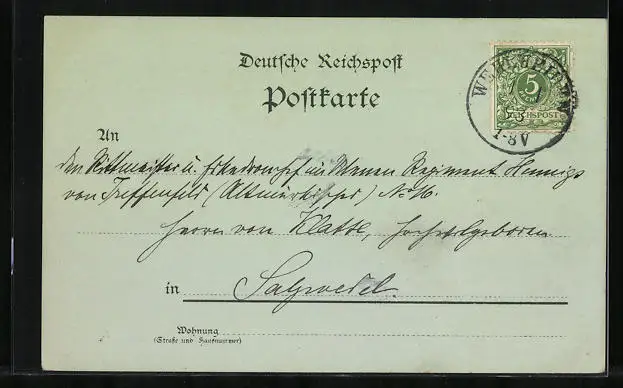 Personenbezogene Daten auf der Rückseite der Karte wurden durch blauen Textmarker unkenntlich gemacht. Die blauen Stellen sind auf die Vorderseite durchgeweicht und wirken sich negativ auf das Postkartenfoto aus