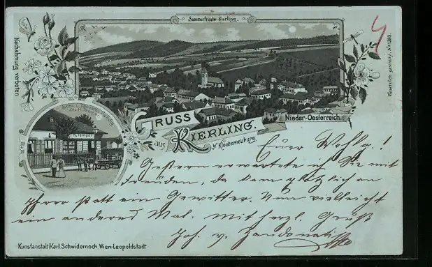 Mondschein-Lithographie Kierling b. Klosterneuburg, Delicatessen-Handlung des H. Temper, Ortsansicht