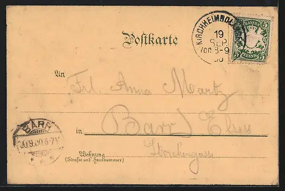 Personenbezogene Daten auf der Rückseite der Karte wurden durch blauen Textmarker unkenntlich gemacht. Die blauen Stellen sind auf die Vorderseite durchgeweicht und wirken sich negativ auf das Postkartenfoto aus