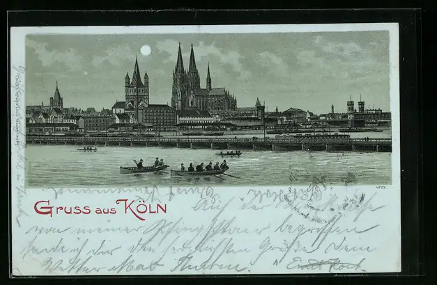 Mondschein-Lithographie Köln, Panorama mit Rheinbrücke und Dom