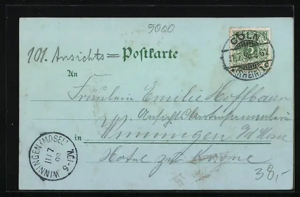 Personenbezogene Daten auf der Rückseite der Karte wurden durch blauen Textmarker unkenntlich gemacht. Die blauen Stellen sind auf die Vorderseite durchgeweicht und wirken sich negativ auf das Postkartenfoto aus