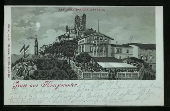 Mondschein-Lithographie Königswinter, Restaurant Drachenfels