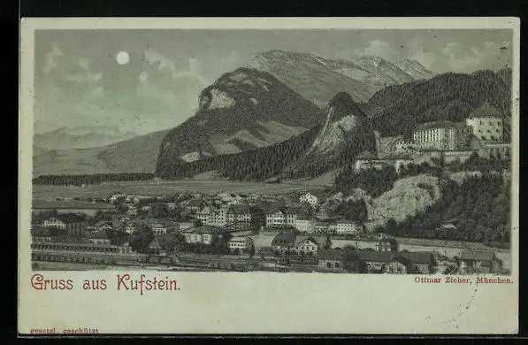 Mondschein-Lithographie Kufstein, Teilansicht mit Bergen