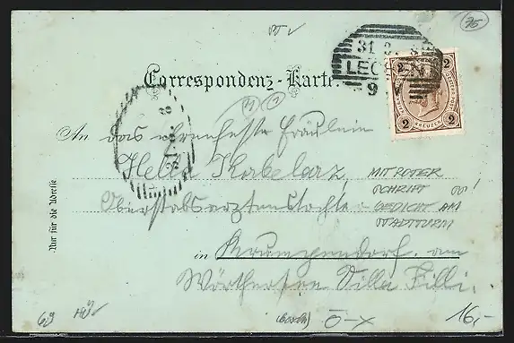 Personenbezogene Daten auf der Rückseite der Karte wurden durch blauen Textmarker unkenntlich gemacht. Die blauen Stellen sind auf die Vorderseite durchgeweicht und wirken sich negativ auf das Postkartenfoto aus