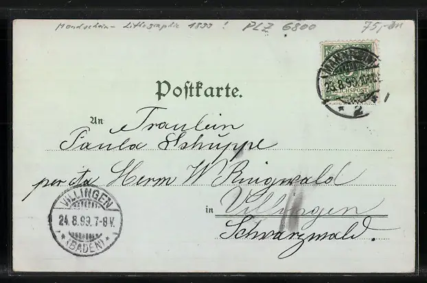 Personenbezogene Daten auf der Rückseite der Karte wurden durch blauen Textmarker unkenntlich gemacht. Die blauen Stellen sind auf die Vorderseite durchgeweicht und wirken sich negativ auf das Postkartenfoto aus
