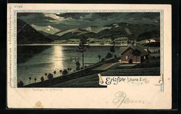 Mondschein-Lithographie Maria Zell, Partie am Erlafsee