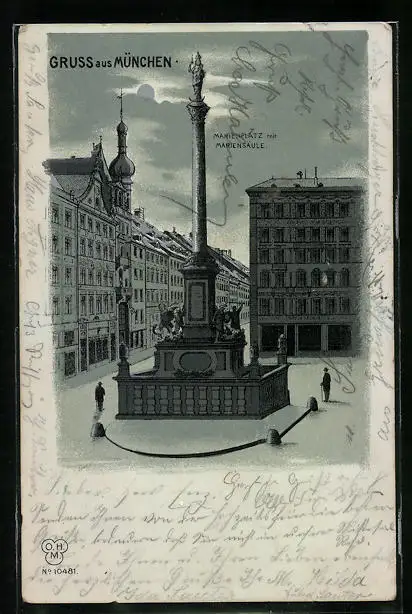 Mondschein-Lithographie München, Marienplatz mit Mariensäule