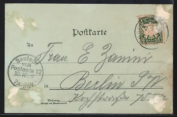 gelaufen 1897, vorder- u. rückseitig Klebe- und Papierreste, rückseitig Oberflächenschaden, Oberflächenschaden li. u. re. u. oben u. unten mittig, guter Zustand