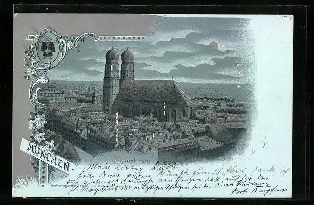 Mondschein-Lithographie München, Teilansicht mit Frauenkirche aus der Vogelschau