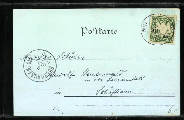 Personenbezogene Daten auf der Rückseite der Karte wurden durch blauen Textmarker unkenntlich gemacht. Die blauen Stellen sind auf die Vorderseite durchgeweicht und wirken sich negativ auf das Postkartenfoto aus