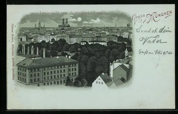 Mondschein-Lithographie München, Totalansicht vom Haidhauserkirchthurm