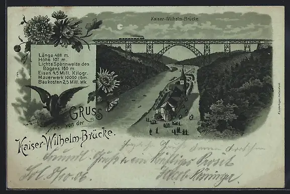 Mondschein-Lithographie Müngsten, Kaiser-Wilhelm-Brücke mit Eisenbahn