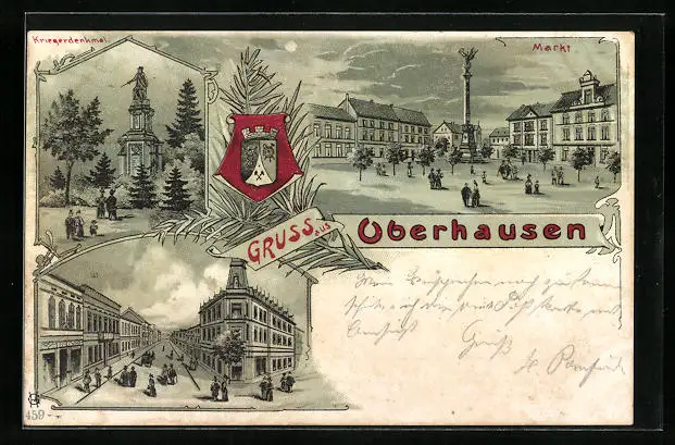 Mondschein-Lithographie Oberhausen, Markt und Kriegerdenkmal