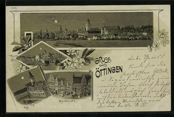 Mondschein-Lithographie Öttingen, Kgl. Rentamt, Marktplatz, Wörnitz-Brücke
