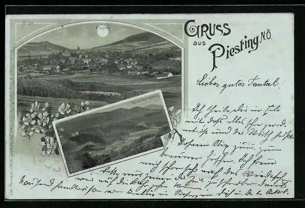 Mondschein-Lithographie Piesting, Ortsansicht, Ruine Starhemberg