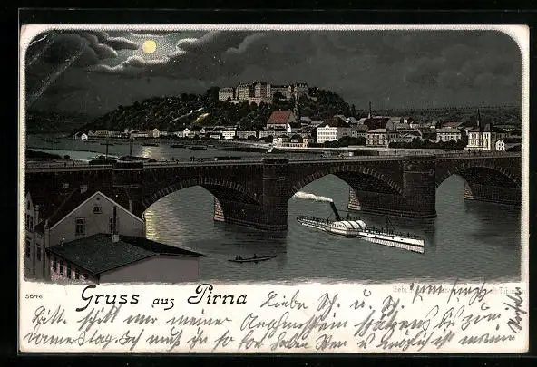 Mondschein-Lithographie Pirna, Uferpartie mit Brücke