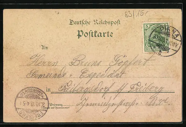 Personenbezogene Daten auf der Rückseite der Karte wurden durch blauen Textmarker unkenntlich gemacht. Die blauen Stellen sind auf die Vorderseite durchgeweicht und wirken sich negativ auf das Postkartenfoto aus