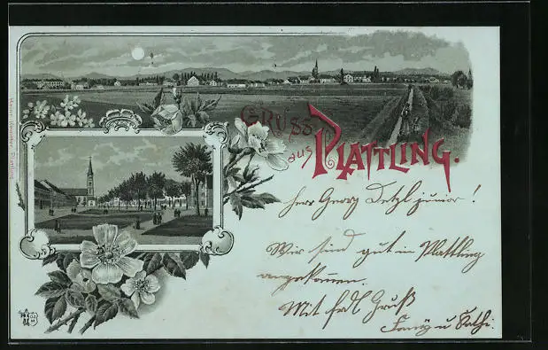 Mondschein-Lithographie Plattling, Teilansicht, Ortspartie mit Kirche