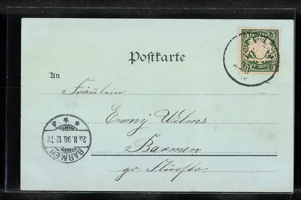 Personenbezogene Daten auf der Rückseite der Karte wurden durch blauen Textmarker unkenntlich gemacht. Die blauen Stellen sind auf die Vorderseite durchgeweicht und wirken sich negativ auf das Postkartenfoto aus