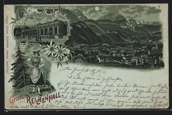 Mondschein-Lithographie Reichenhall, Teilansicht, Colonnaden, Frau in Tracht