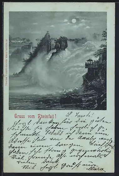 Mondschein-Lithographie Rheinfall, Wasserfall mit Aussichtspunkt