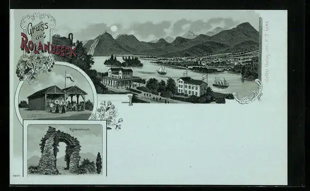 Mondschein-Lithographie Rolandseck, Restauration Rolandseck, Rolandsbogen, Ortsansicht