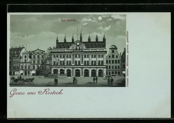 Mondschein-Lithographie Rostock, Rathaus im Vollmondlicht