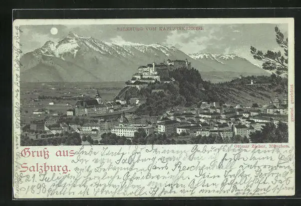 Mondschein-Lithographie Salzburg, Totalansicht vom Kapuzinerberg